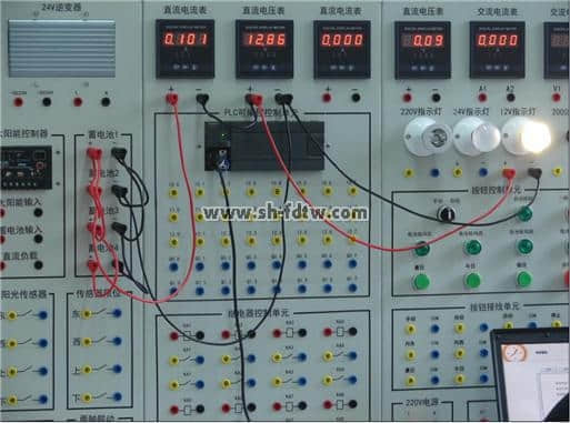 光伏發(fā)電控制監(jiān)控系統(tǒng)由電池板單元、太陽(yáng)能控制器單元、蓄電池單元、保險(xiǎn)單元、陽(yáng)光傳感器、傳感器限位單元、模擬太陽(yáng)單元、兩軸聯(lián)動(dòng)單元、plc控制單元、繼電器單元、按鈕及按鈕接線單元、和相應(yīng)的逆變器儀表電源組成。光伏發(fā)電控制監(jiān)控系統(tǒng)采用接插線的形式進(jìn)行接線,方便學(xué)生自行設(shè)計(jì)實(shí)訓(xùn)。